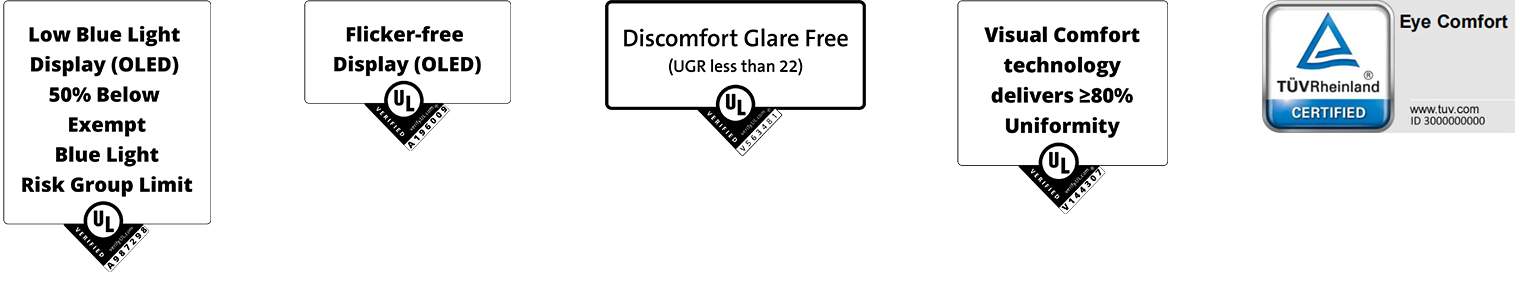*Az OLED paneleket alacsonykék fényű, villogó, kellemetlen vakító fényű, látványos kényelemként tanúsították, nagy egységességgel és prefektus fekete prefektusként a biztosítási laboratóriumok (UL).
